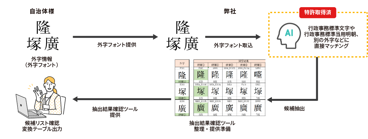 弊社で作成した文字同定 AIを用いて、自治体様でお使いの外字とご指定の文字とのマッチングを行います。